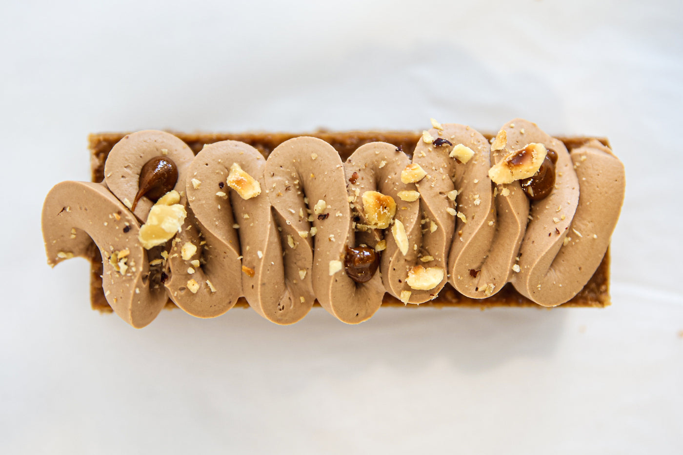 Dacquoise au cacao, croustillant praliné, ganache montée au chocolat au lait et café
