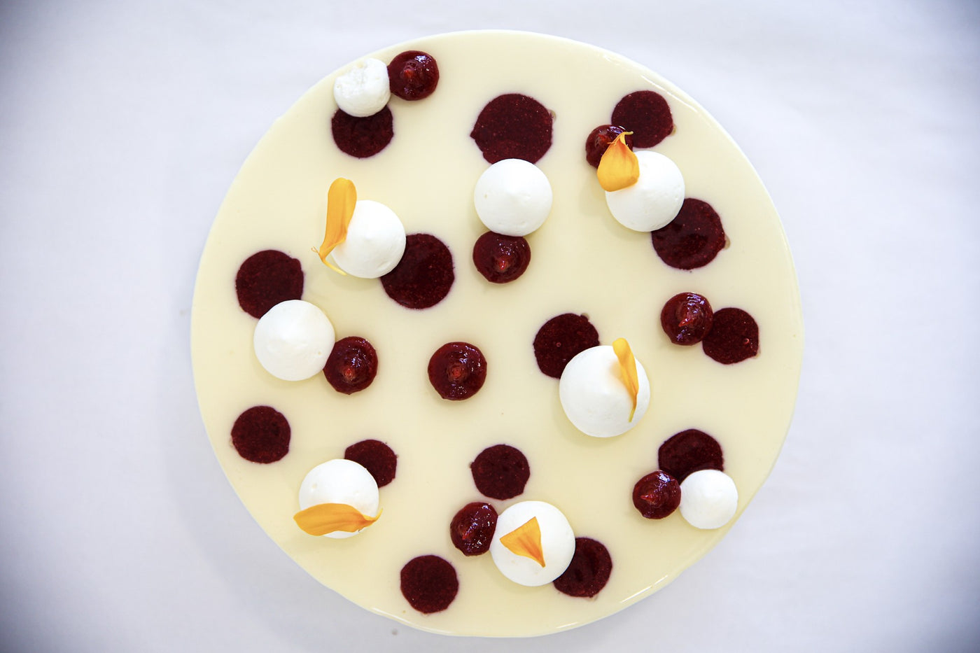 Mousse au chocolat blanc, insert de framboise, mousse aux amandes, croustillant praliné, compotée de framboise